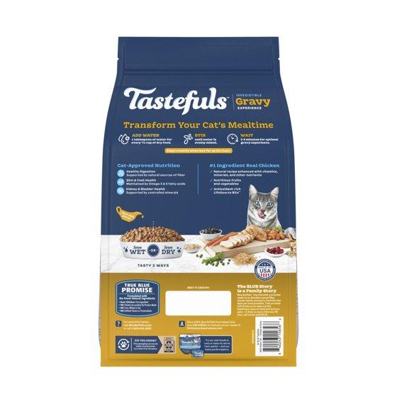 - INCLUDED IN PACKAGE: Contains one (1) 5-lb. bag of BLUE Tastefuls Irresistible Gravy Experience Adult Indoor Cat Dry Food, Chicken & Brown Rice Recipe