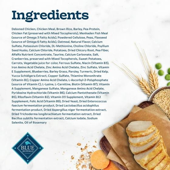 INGREDIENTS: Deboned Chicken, Chicken Meal, Brown Rice, Barley, Pea Protein, Chicken Fat (preserved with Mixed Tocopherols), Menhaden Fish Meal (source of Omega 3 Fatty Acids), Powdered Cellulose, Peas, Flaxseed (source of Omega 6 Fatty Acids), Oatmeal, Natural Flavor, Calcium Sulfate, Potassium Chloride, DL-Methionine, Choline Chloride, Psyllium Seed Husks, Calcium Chloride, Potatoes, Dried Chicory Root, Pea Fiber, Alfalfa Nutrient Concentrate, Taurine, Calcium Carbonate, Salt, Cranberries, preserved with Mixed Tocopherols, Sweet Potatoes, Carrots, Vegetable juice for color, Ferrous Sulfate, Niacin (Vitamin B3), Iron Amino Acid Chelate, Zinc Amino Acid Chelate, Zinc Sulfate, Vitamin E Supplement, Blueberries, Barley Grass, Parsley, Turmeric, Dried Kelp, Yucca Schidigera Extract, Copper Sulfate, Thiamine Mononitrate (Vitamin B1), Copper Amino Acid Chelate, L-Ascorbyl-2-Polyphosphate (source of Vitamin C), L-Lysine, L-Carnitine, Biotin (Vitamin B7), Vitamin A Supplement, Manganese Sulfate, Manganese Amino Acid Chelate, Pyridoxine Hydrochloride (Vitamin B6), Calcium Pantothenate (Vitamin B5), Riboflavin (Vitamin B2), Vitamin D3 Supplement, Vitamin B12 Supplement, Folic Acid (Vitamin B9), Dried Yeast, Dried Enterococcus faecium fermentation product, Dried Lactobacillus acidophilus fermentation product, Dried Aspergillus niger fermentation extract, Dried Trichoderma longibrachiatum fermentation extract, Dried Bacillus subtilis fermentation extract, Calcium Iodate, Sodium Selenite, Oil of Rosemary. GUARANTEED ANALYSIS: Crude Protein 32.0 % min. Crude Fat 15.0 % min. Crude Fiber 6.0 % max. Moisture 9.0 % max. Taurine 0.15 % min. Omega 3 Fatty Acids* 0.5 % min. Omega 6 Fatty Acids* 2.5 % min. *Not recognized as an essential nutrient by the AAFCO Cat Food Nutrient Profiles