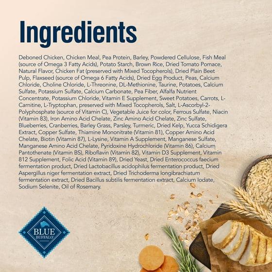 INGREDIENTS: Deboned Chicken, Chicken Meal, Pea Protein, Barley, Powdered Cellulose, Menhaden Fish Meal (source of Omega 3 Fatty Acids), Potato Starch, Brown Rice, Dried Tomato Pomace, Natural Flavor, Dried Plain Beet Pulp, Chicken Fat (preserved with Mixed Tocopherols), Flaxseed (source of Omega 6 Fatty Acids), Dried Egg Product, Peas, Calcium Chloride, Choline Chloride, L-Threonine, DL-Methionine, Canola Oil, Taurine, Potatoes, Calcium Sulfate, Potassium Sulfate, Calcium Carbonate, Pea Fiber, Alfalfa Nutrient Concentrate, Potassium Chloride, Vitamin E Supplement, Sweet Potatoes, Carrots, L-Carnitine, L-Tryptophan, preserved with Mixed Tocopherols, Salt, L-Ascorbyl-2-Polyphosphate (source of Vitamin C), Vegetable Juice for color, Ferrous Sulfate, Niacin (Vitamin B3), Iron Amino Acid Chelate, Zinc Amino Acid Chelate, Zinc Sulfate, Blueberries, Cranberries, Barley Grass, Parsley, Turmeric, Dried Kelp, Yucca Schidigera Extract, Copper Sulfate, Thiamine Mononitrate (Vitamin B1), Copper Amino Acid Chelate, Biotin (Vitamin B7), L-Lysine, Vitamin A Supplement, Manganese Sulfate, Manganese Amino Acid Chelate, Pyridoxine Hydrochloride (Vitamin B6), Calcium Pantothenate (Vitamin B5), Riboflavin (Vitamin B2), Vitamin D3 Supplement, Vitamin B12 Supplement, Folic Acid (Vitamin B9), Dried Yeast, Dried Enterococcus faecium fermentation product, Dried Lactobacillus acidophilus fermentation product, Dried Aspergillus niger fermentation extract, Dried Trichoderma longibrachiatum fermentation extract, Dried Bacillus subtilis fermentation extract, Calcium Iodate, Sodium Selenite, Oil of Rosemary. GUARANTEED ANALYSIS: Crude Protein 36.0% min. Crude Fat 12.0% min. Crude Fat 15.0% max. Crude Fiber 12.0% max. Moisture 9.0% max. Vitamin E 300 IU/kg min. Taurine* 0.2% min. Omega 3 Fatty Acids* 0.5% min. Omega 6 Fatty Acids* 2.25% min. Ascorbic Acid (source of Vitamin C)* 100 mg/kg min. L-Carnitine* 400 mg/kg min. *Not recognized as an essential nutrient by the AAFCO Cat Food Nutrient Profiles.