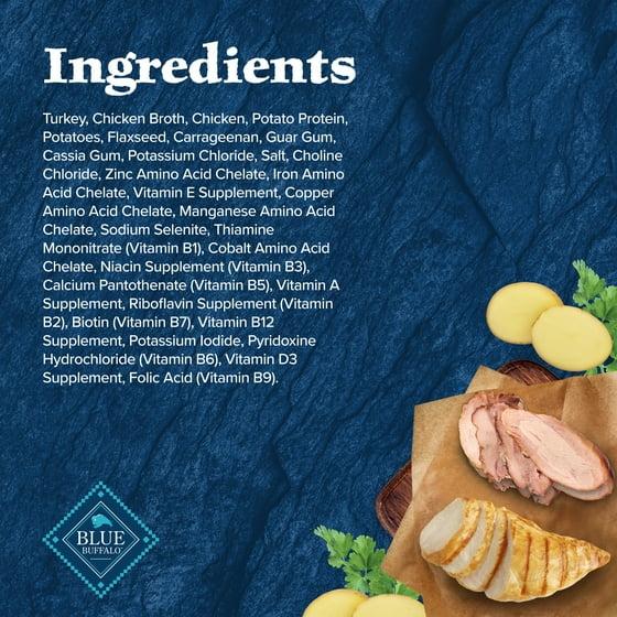 INGREDIENTS: Chicken, Fish Broth, Chicken Liver, Salmon, Potatoes, Flaxseed, Carrageenan Guar Gum, Cassia Gum, Potassium Chloride, Salt, Zinc Amino Acid Chelate, Iron Amino Acid Chelate, Choline Chloride, Thiamine Mononitrate (Vitamin B1), Vitamin E Supplement, Copper Amino Acid Chelate, Manganese Amino Acid Chelate, Sodium Selenite, Cobalt Amino Acid Chelate, Niacin Supplement (Vitamin B3), Calcium Pantothenate (Vitamin B5), Vitamin A Supplement, Riboflavin Supplement (Vitamin B2), Biotin (Vitamin B7), Vitamin B12 Supplement, Potassium Iodide, Pyridoxine Hydrochloride (Vitamin B6), Vitamin D3 Supplement, Folic Acid (Vitamin B9). GUARANTEED ANALYSIS: Crude Protein 10% min. Crude Fat 8% min. Crude Fiber 1.5% max. Moisture 78.0% max.