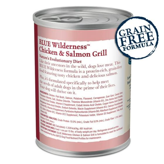 - Contains: one (1) 12.5-oz. cans of BLUE Wilderness Adult Wet Dog Food, Salmon & Chicken Grill