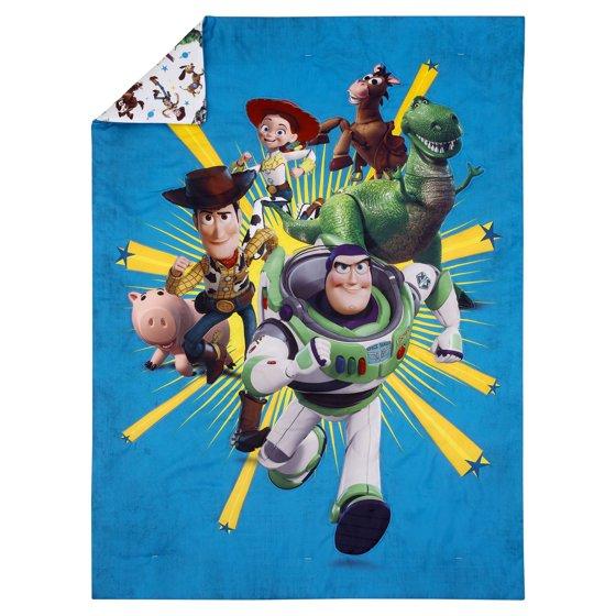 - Disney Toy Story Taking Action 4-Piece Toddler Bedding set, featuring Buzz, Woody, and other favorite Toy Story characters