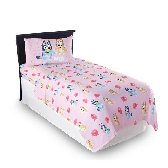 Give your child's bedroom a makeover with this exciting Bluey 3-Piece Twin Sheet Set. Bring the fun and friendly adventures of Bluey to your child's bedroom. This complete sheet set includes a high-quality fitted sheet, flat sheet, and one reversible pillowcase for a coordinated Bluey theme. All components are crafted from an extremely soft microfiber material with vibrant colors and a bold design. Additional Bluey kids bedding components like blankets and throws sold separately only on ! CARE INSTRUCTIONS: Wash before use. Machine wash cold. Wash dark colors separately. Only non-chlorine bleach when needed. Tumble dry low. Warm iron only.