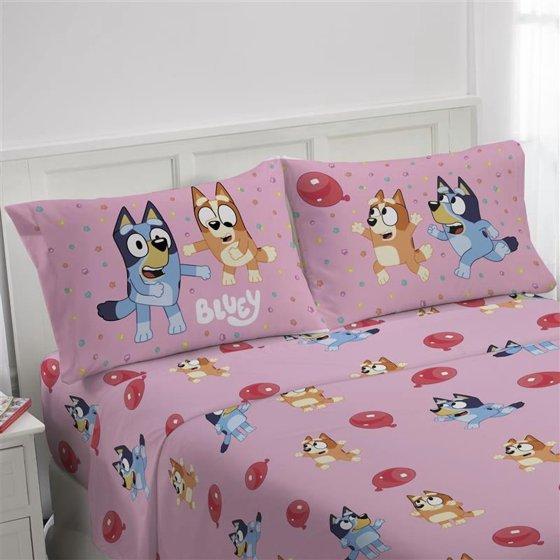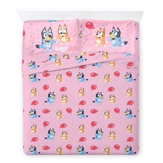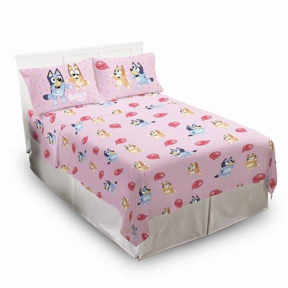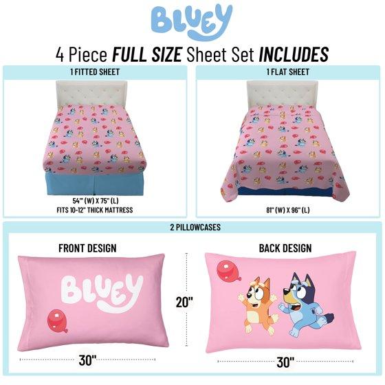 Give your child's bedroom a makeover with this exciting Bluey 4-Piece Full Sheet Set. Bring the fun and friendly adventures of Bluey to your child's bedroom. This complete sheet set includes a high-quality fitted sheet, flat sheet, and two reversible pillowcases for a coordinated Bluey theme. All components are crafted from an extremely soft microfiber material with vibrant colors and a bold design. Additional Bluey kids bedding components like blankets and throws sold separately only on Walmart.com! CARE INSTRUCTIONS: Wash before use. Machine wash cold. Wash dark colors separately. Only non-chlorine bleach when needed. Tumble dry low. Warm iron only.