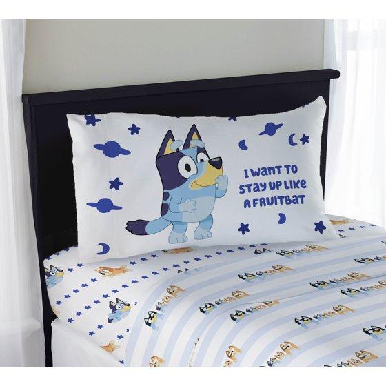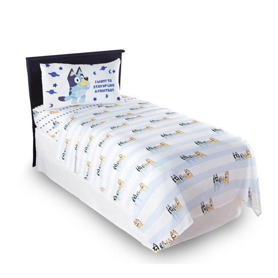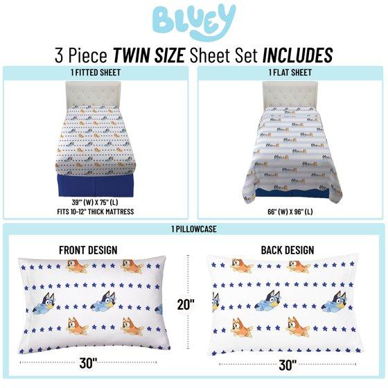 Give your child's bedroom a makeover with this exciting Bluey 3-Piece Twin Sheet Set. Bring the fun and friendly adventures of Bluey to your child's bedroom. This complete sheet set includes a high-quality fitted sheet, flat sheet, and two pillowcases for a coordinated Bluey theme. All components are crafted from an extremely soft microfiber material with vibrant colors and a bold design. Additional Bluey kids bedding components like blankets and throws sold separately only on Walmart.com! CARE INSTRUCTIONS: Wash before use. Machine wash cold. Wash dark colors separately. Only non-chlorine bleach when needed. Tumble dry low. Warm iron only.