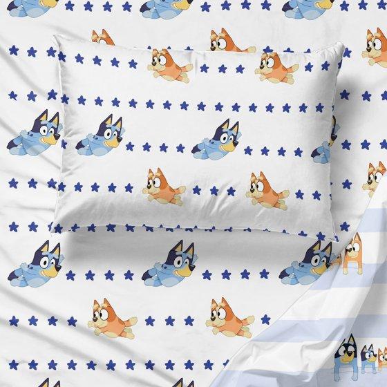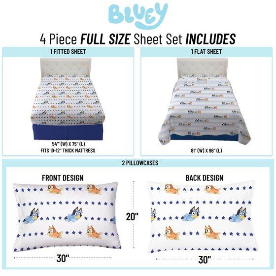 Give your child's bedroom a makeover with this exciting Bluey 4-Piece Full Sheet Set. Bring the fun and friendly adventures of Bluey to your child's bedroom. This complete sheet set includes a high-quality fitted sheet, flat sheet, and two reversible pillowcases for a coordinated Bluey theme. All components are crafted from an extremely soft microfiber material with vibrant colors and a bold design. Additional Bluey kids bedding components like blankets and throws sold separately only on Walmart.com! CARE INSTRUCTIONS: Wash before use. Machine wash cold. Wash dark colors separately. Only non-chlorine bleach when needed. Tumble dry low. Warm iron only.