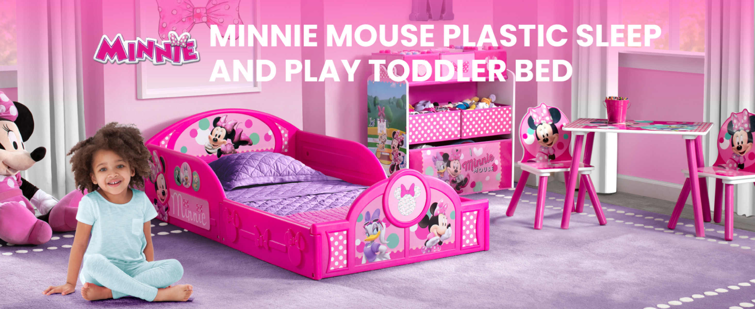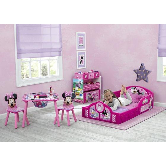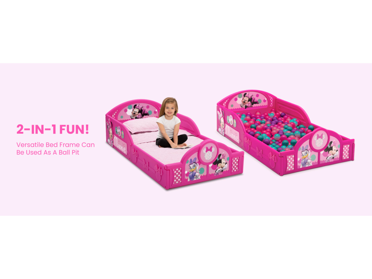 Transition their space from a nursery to a toddler room with the perfectly sized Minnie Mouse Plastic Sleep and Play Toddler Bed from Delta Children. Featuring three-dimensional silhouettes of Minnie Mouse with colorful decals of Minnie, Daisy Duck, Figaro and Bella, this sturdy toddler bed creates a comforting environment that promotes a sound sleep. Attached Guardrails: Attached guardrails will ensure your little one is safe and secure throughout the night. A low mattress height makes it easy for kids to enter and exit on their own, reinforcing their big-kid independence. Sturdy Plastic: Built to last, this toddler bed?s sturdy plastic construction creates a cozy, inviting environment, promoting sound sleep for your little one. About Minnie Mouse: Sweet, stylish and a lover of all things polka dot, Minnie Mouse spends her free time dancing, singing and hanging out with her lifelong sweetheart, Mickey. Help bring her cheerful spirit to your little one?s room with this item from Delta Children?s colorful collection of Minnie Mouse kids' furniture.