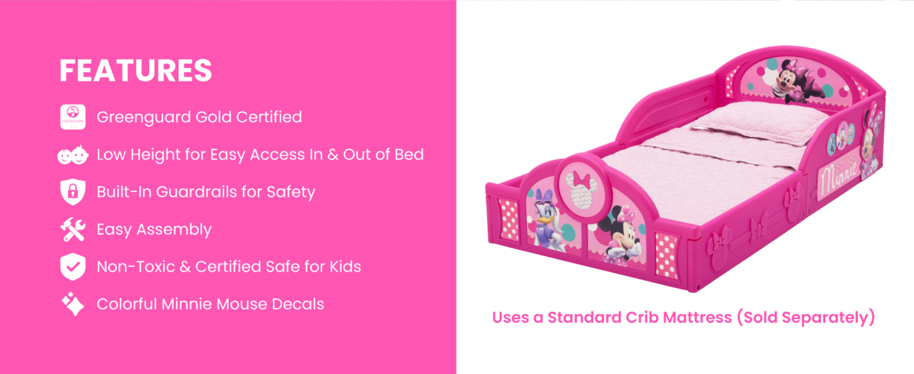 - MINNIE MOUSE GRAPHICS AND DESIGN: This toddler bed features bold decals and graphics of Minnie, Daisy Duck, Figaro and Bella
