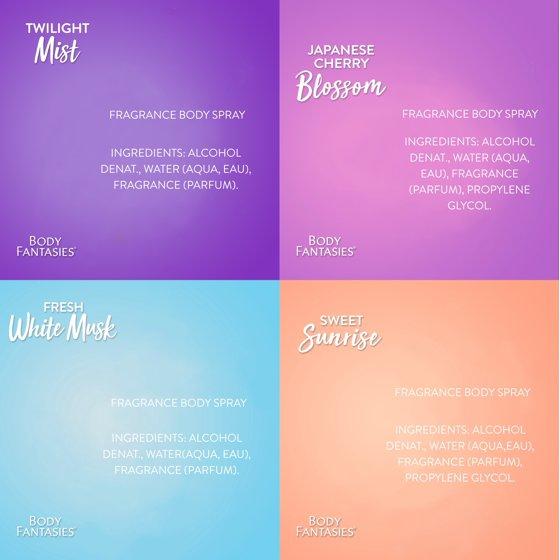 Twilight Mist: ALCOHOL DENAT., WATER (AQUA, EAU), FRAGRANCE (PARFUM). Fresh White Musk: ALCOHOL DENAT., WATER (AQUA, EAU), FRAGRANCE (PARFUM). Japanese Cherry Blossom: ALCOHOL DENAT., WATER (AQUA, EAU), FRAGRANCE (PARFUM), PROPYLENE GLYCOL Sweet Sunrise: ALCOHOL DENAT., WATER (AQUA, EAU), FRAGRANCE (PARFUM), PROPYLENE GLYCOL.