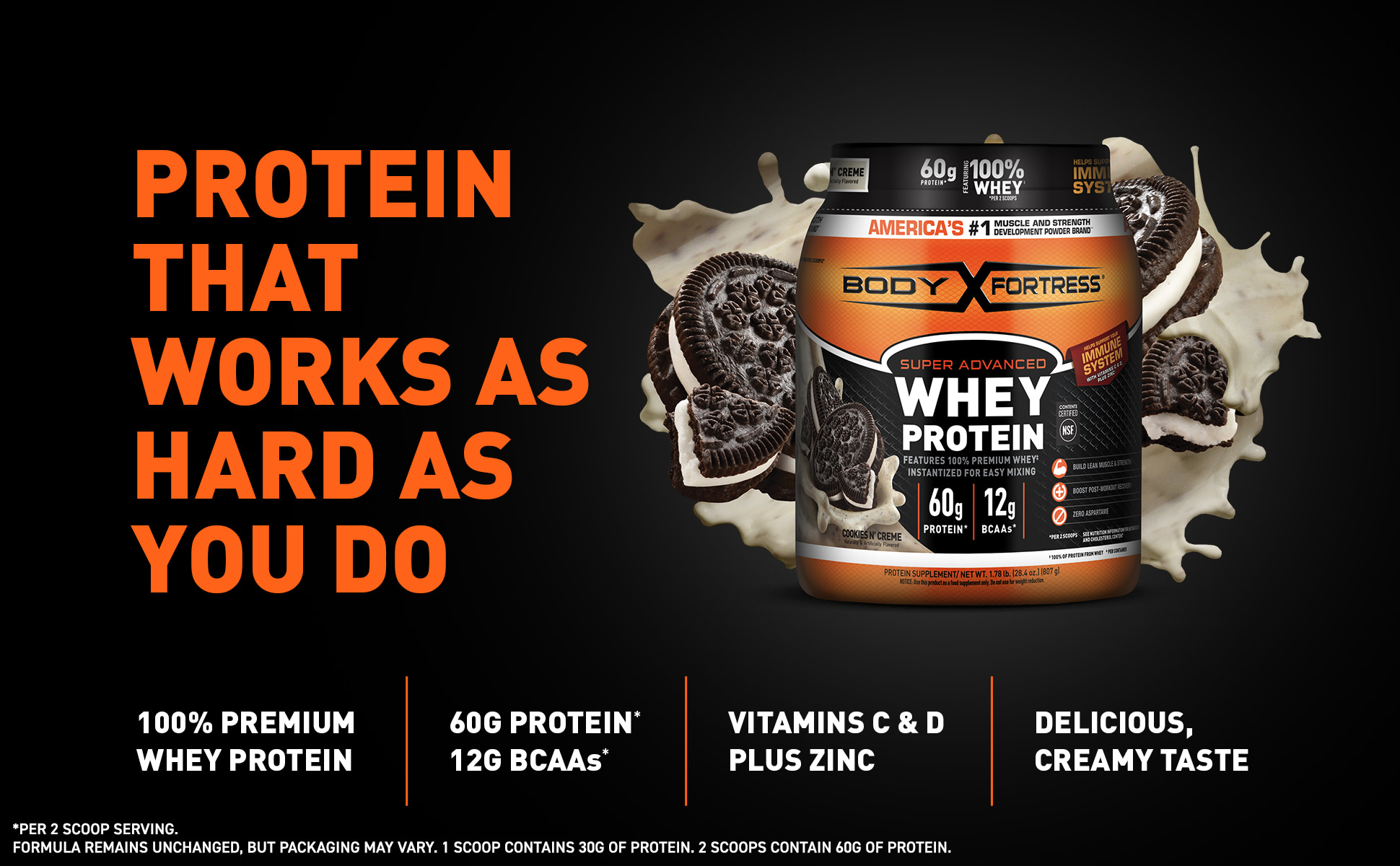 Body Fortress Super Advanced 100% Premium Whey Protein Powder, Cookies N' Creme, 60g Protein, Immune Support , Vitamins C & D Plus Zinc, 1.78 lbs