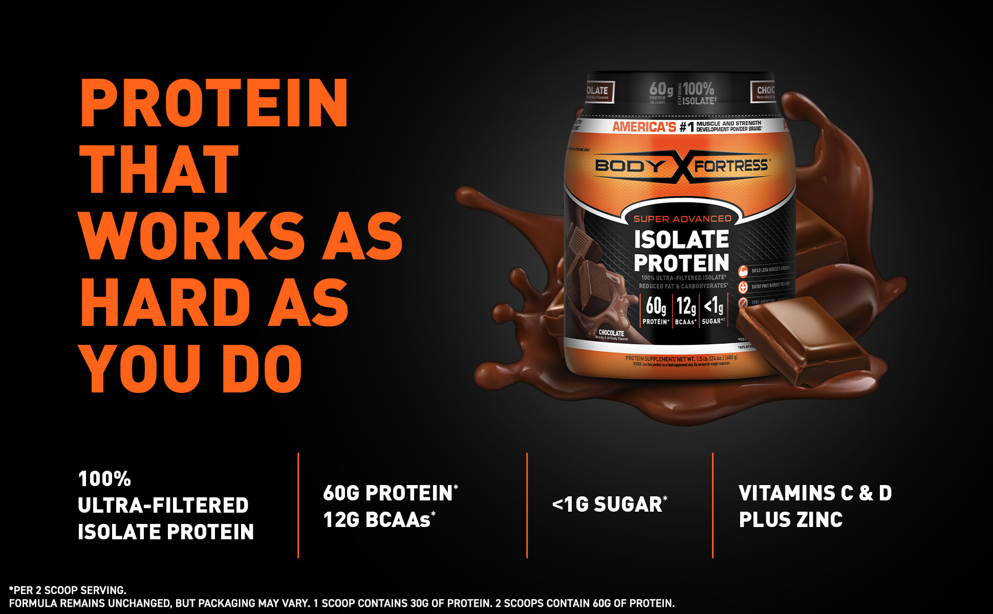 - Power Packed Protein Source: Build your fortress with this no-nonsense, 100% ultra-filtered isolate protein powder. With every two (2) scoops, you get 60g of protein and 12g of BCAAs (Branched-Chain Amino Acids).