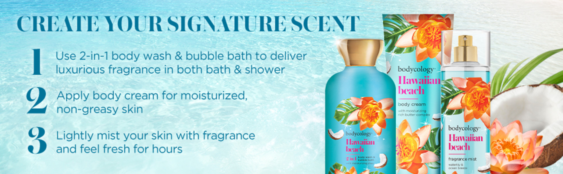 - IMMERSE YOURSELF IN HAWAIIAN BEACH: Bodycology’s Hawaiian Beach collection also includes a rich shea butter body cream, 2-in-1 body wash & bubble bath, soy candle and exfoliating sugar scrub for a truly indulgent experience