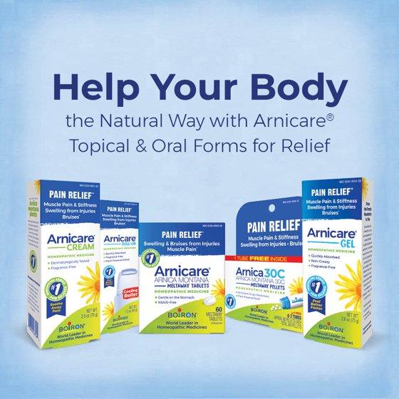 - Provides general pain relief and can be used with Boiron Arnicare® Gel, Cream, or Ointment for spot treatment.