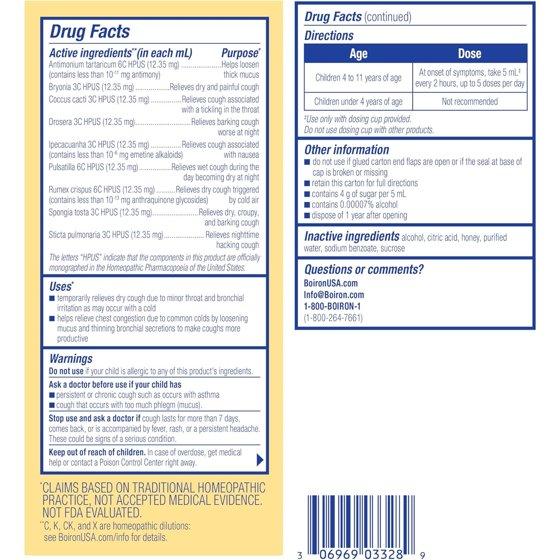 Active Ingredients: Dulcamara 5C HPUS (Relieves cold and coughs worsened by exposure to damp cold), Ferrum phosphoricum 9C HPUS (Relieves colds with gradual onset, minor sore throat, and dry, fitful cough), Hydrastis canadensis 9C HPUS (Relieves colds and coughs associated with runny nose), Kali Bichromicum 9C HPUS (Relieves nasal discharge), Nux Vomica 9C HPUS (0.13mg) (Relieves sneezing fits) Inactive Ingredients: alcohol, citric acid, purified water, sodium benzoate, sucrose