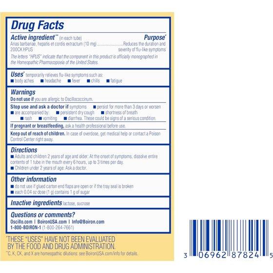 - HOMEOPATHIC FLU RELIEF: Oscillococcinum works with your body to help temporarily relieve fatigue, headache, body aches, chills & fever. Safe for ages 2 & up, take at the first sign of flu-like symptoms.