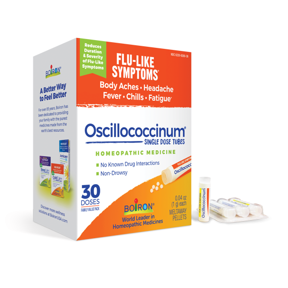 The moment you feel achy or run down, take Boiron Oscillococcinum and feel like yourself again. Clinical studies show that Oscillococcinum reduces the duration and severity of flu symptoms such as body aches, headache, fever, chills and fatigue. 1-2 Easy to take, the meltaway pellets dissolve under the tongue and are recommended for everyone ages 2 and up.