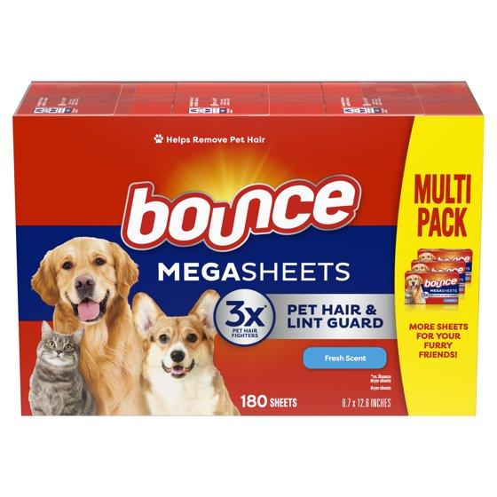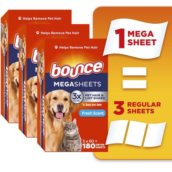 - Includes 3 boxes of 60 count Bounce Pet Hair and Lint Guard Mega Dryer Sheets with 3X Pet Hair Fighters in the Fresh Scent, a total of 180 mega dryer sheets
