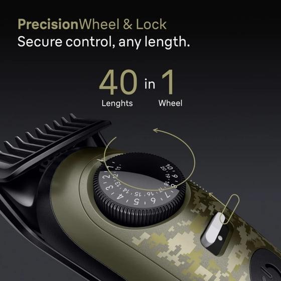 Braun All-in-One Series 7 Trimmer Kit, Lifetime Sharp Metal Blade, Up to 120 min, 40 Lengths, PrecisionWheel & Lock, Waterproof, AIO 7550, Camouflage Green