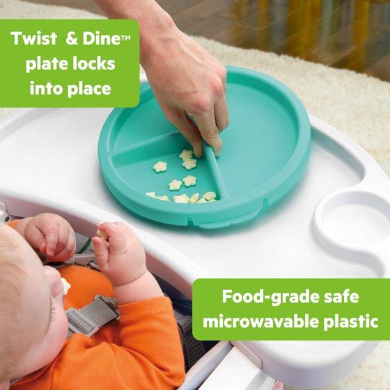 • Includes 3-section Twist & Dine plate that encourages baby’s self-feeding skills; plate locks securely in place to prevent tossing to the floor; food-grade safe and microwavable