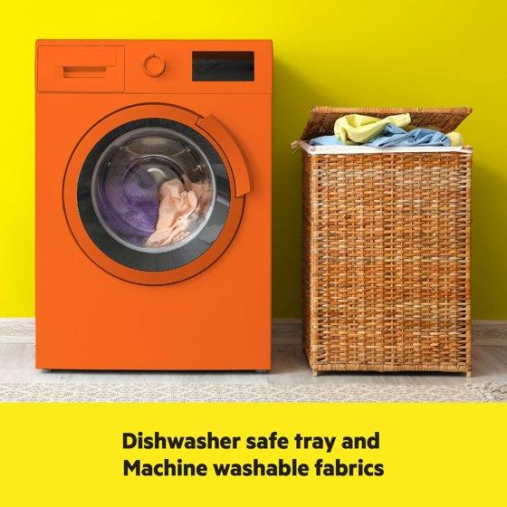 Frame: Wipe with a damp cloth, mild soap, and warm water. Never use bleach or detergent. Fabric and Bag: Remove fabric from frame. Lock restraint buckles and place in a laundry bag. Machine wash cold, gentle cycle. Do not bleach. Do not tumble dry. Line or hang dry. Do not iron. Do not dry clean. Tray: Dishwasher safe, top rack only.
