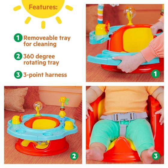 Turn playtime, snack time, AND mealtime into a tropical adventure with the Bright Starts Playful Paradise 3-in-1 SuperSeat! Choose from three modes: activity seat with interactive toys, floor seat with rotating tray for snack time, and booster seat for mealtime at the table. This versatile seat grows with baby from 6 months to 3 years old or up to 33lbs. In activity seat mode, young babies will have a supportive place to sit once they learn to hold their head up on their own. The EVA foam insert provides extra comfort and support for early sitters. Watch baby explore the 360-degree rotating tray and 6 sensory toys: dangling monkey crinkle toy and toucan squeaker toy (both removable for on the go, too!), spinning alligator and lion gears, giraffe with beads and crinkle leaf, and a spinning ball with cascading beads. When baby works up an appetite, simply spin the tray with room for snacks and two included cupholders. For mealtime, use booster mode by removing the tray and attaching the seat to an adult dining chair with the included straps. The SuperSeat includes a 3-point safety harness to keep baby secure while they play or dine. Snacking portion of tray is dishwasher safe. Other parts wipe clean. Dimensions: 22.05 in (H) x 22.44 in (W) x 22.44 in (L).