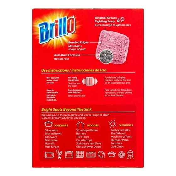 Brillo Steel Wool Soap Pads, Original Scent. Powers Out Grease and Grime. These soap pads are designed to remove the toughest grease and grime. The classic square shape reaches into corners to knock out tough messes, while its unique bonded edges help maintain its iconic shape. Give it a try. The anti-rust formula restores grills, pots, and baking sheets to their former glory. That's why Brillo is one of the most trusted names in household cleaning. A long-lasting soap pad with anti-rust formula has 29% more soap and 8% more steel wool than any other soap pad. The iconic square shape allows the soap pad's unique bonded edges to easily reach tough messes in corners. Recyclable.