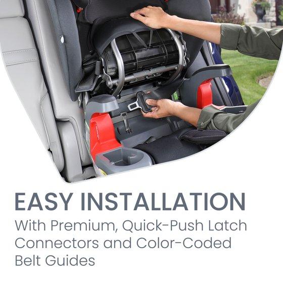 - INSTALL EASILY: Quick-push LATCH connectors and the color-coded belt guide makes installation quick and easy BRITAX SAFETY: Features a high-strength steel frame, a crumple zone, a patented V-shaped tether, and two layers of energy management PREMIUM COMFORT: The padding, fabrics and stay-put harness pads help keep your child’s neck from rubbing against the harness strap