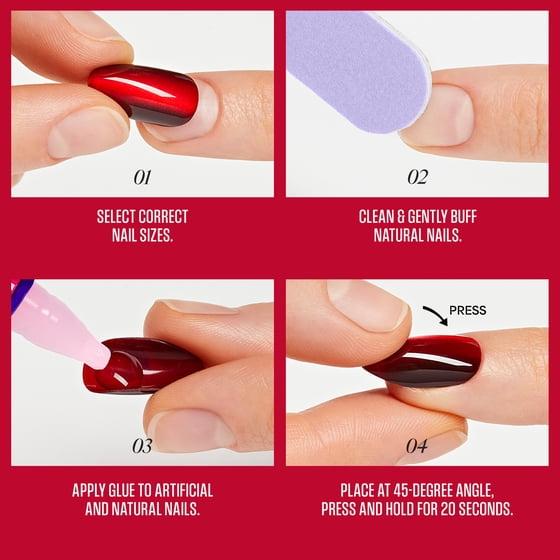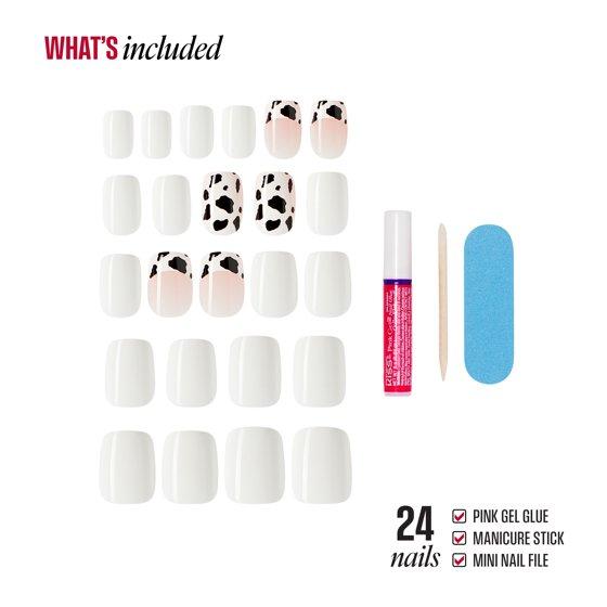 - Nail kit includes 24 fake nails, pink gel nail glue net wt. 2g (0.07oz.), mini nail file, & manicure stick