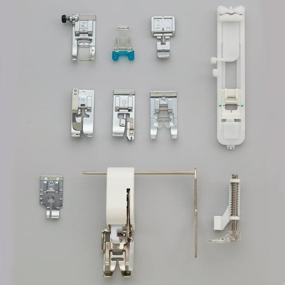 • 10 sewing & quilting feet: Spring action zigzag, monogramming, overcasting, zipper, blind stitch, button sewing, buttonhole, ¼" piecing, walking, spring action quilting feet, plus quilt guide