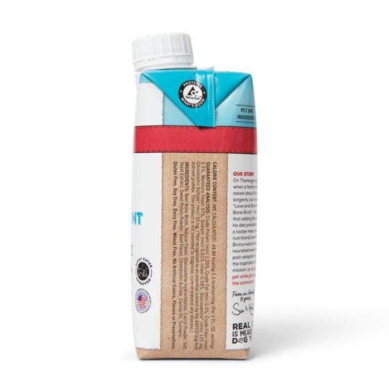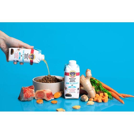 Our Hip and Joint functional Beef Bone Broth is perfectly sized to encourage protein rotation and trial. Our all-natural, human-grade bone broth is safe for your pet and contains functional ingredients to reduce inflammation and support hip and joint health. Use daily as a meal topper, treat, or as part of an enrichment activity. Rotate with other Brutus Broth products to provide a variety of different amino acids. In addition to providing our pets with collagen, essential amino acids, and added hydration, our Beef Bone Broth is fortified with recommended servings of supplemental glucosamine and chondroitin for hip and joint health, and turmeric, a powerhouse superfood. Because bone broth for humans is not safe for pets (toxic ingredients and high in sodium), we spent years developing our nourishing superfood formula so that you can feel great about feeding your pets something they love. The protein, nutrients, and naturally occurring collagen found in bone broth can help to improve nutrient absorption and chronic digestive disorders, promote healthy skin, hair, teeth, and nails, support mobility, and can help boost energy levels. Brutus Broth can also help pets recovering from injury, illness, or facing mobility issues, eases chewing for puppies and senior dogs, and entices pets with picky palates or lack of appetite to eat.