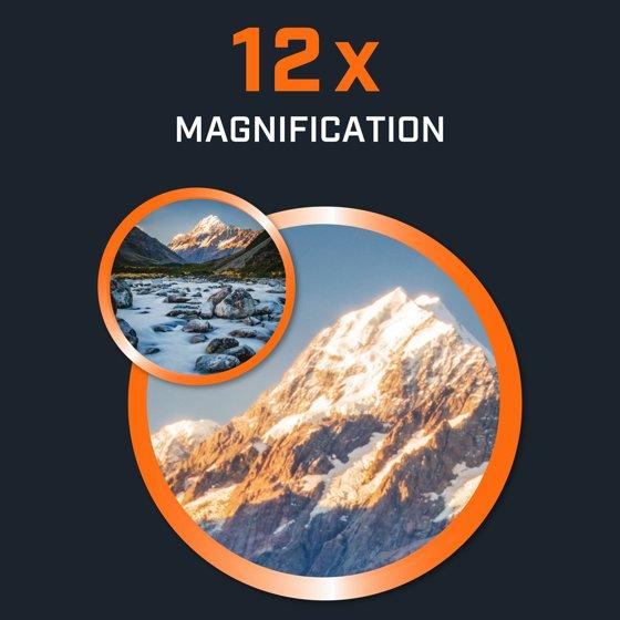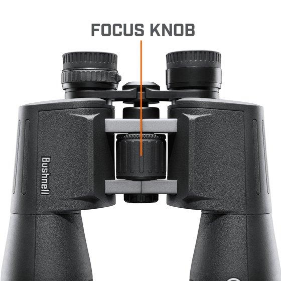 - Binocular, Powerview 212 x magnification. 50 mm objective. Ruggedly designed for all your outdoor adventures. Travel. Sports. Outdoor. Protective rubber armor. Multi coated optics. Metal chassis. Non-slip design conception. Durable rubber armor. Aluminum alloy chasis. Tripod compatible. Multi-coated optics. Accessories Included: Premium neck strap & case. Field of View: 265 inch (88.3 m). Eye Relief: 11 mm. Exit Pupil: 4 mm. Weight: 28.3 oz (805 g). Length 6.7 inch (170 mm). 12x magnification. Multi-coated optics for a bright, clear image. www.bushnell.com. Made in China.