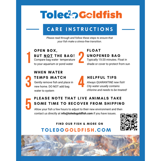 Toledo Goldfish guarantees your order will arrive to you in excellent condition or we will ship replacements or refund your purchase. Step by step acclimation instructions will be included with your order to help insure a smooth transition for your fish.