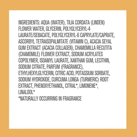 Aqua (Water), Tilia Cordata (Linden) Flower Water, Glycerin, Polyglyceryl-4 Laurate/Sebacate, Polyglyceryl-6 Caprylate/Caprate, Ascorbyl Tetraisopalmitate (Vitamin C), Acacia Seyal Gum Extract (Acacia Collagen), Chamomilla Recutita Flower Extract, Sodium Acrylates Copolymer, Isoamyl Laurate, Xanthan Gum, Lecithin, Sodium Citrate, Parfum (Fragrance), Ethylhexylglycerin, Citric Acid, Potassium Sorbate, Sodium Hydroxide, Curcuma Longa (Turmeric) Root Extract, Phenoxyethanol, Citral*, Limonene*, Linalool* *Naturally Occurring In Fragrance