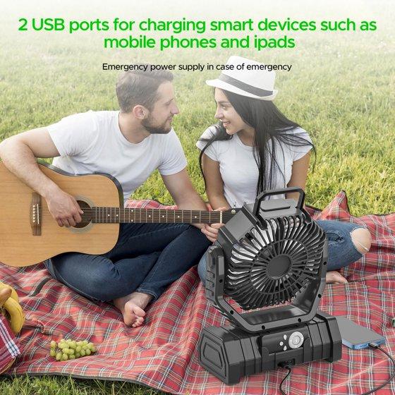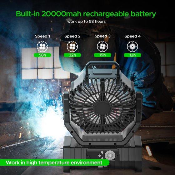 - 20000mAh rechargeable camping fan: This fan has a built-in 20000mAh rechargeable battery, uses high quality motor and ABS material, silent operation, plus 4 different speeds to meet your different use needs, is a perfect portable fan for camping, fishing, travel, barbecue, car, family gatherings and other outdoor and indoor places.