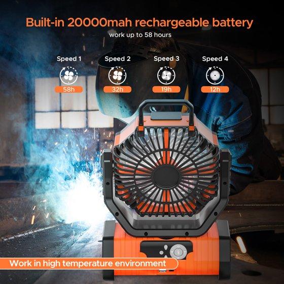 - 20000mAh rechargeable camping fan: This fan has a built-in 20000mAh rechargeable battery, uses high quality motor and ABS material, silent operation, plus 4 different speeds to meet your different use needs, is a perfect portable fan for camping, fishing, travel, barbecue, car, family gatherings and other outdoor and indoor places.