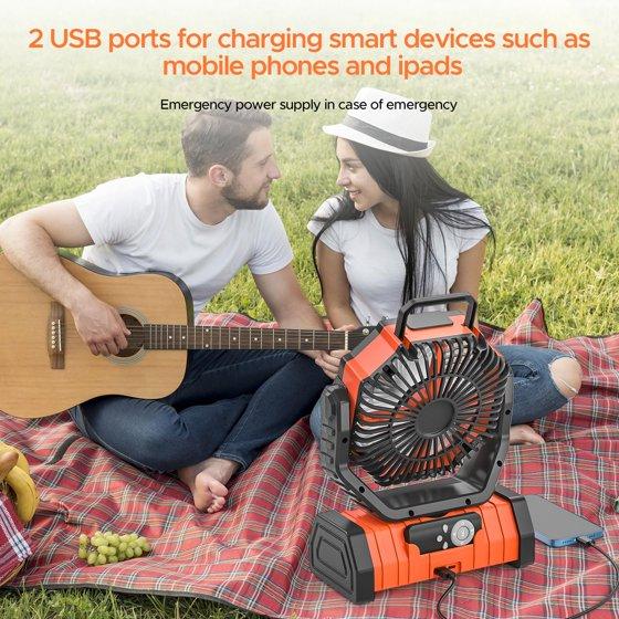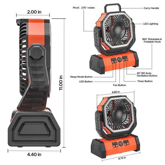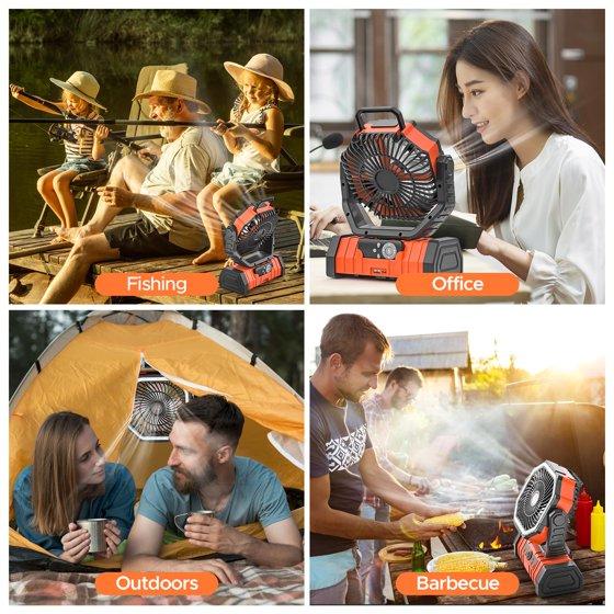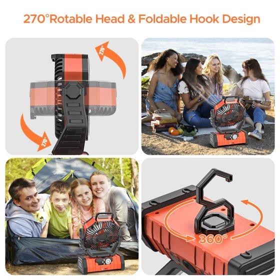 Camping Fan, 20000mAh Rechargeable Battery Operated Outdoor Tent Fan with LED Light & Foldable Hook, 4 Speeds with 270° Rotate Pivot for Camping, Barbecue, kitchen, Fishing, Construction(Orange)