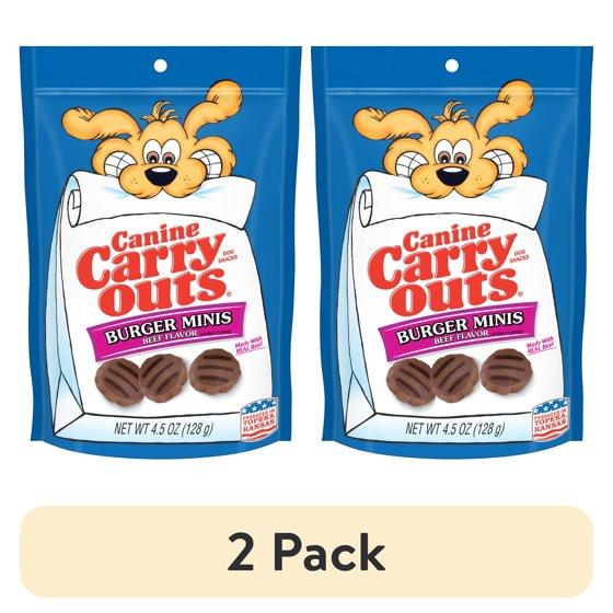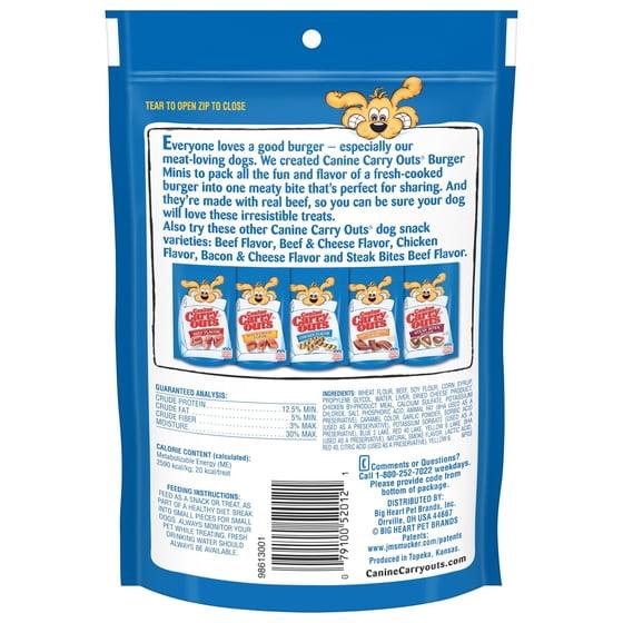 - Contains one (1) 4.5-ounce bag of Canine Carry Outs Burger Minis Beef Flavor dog treats