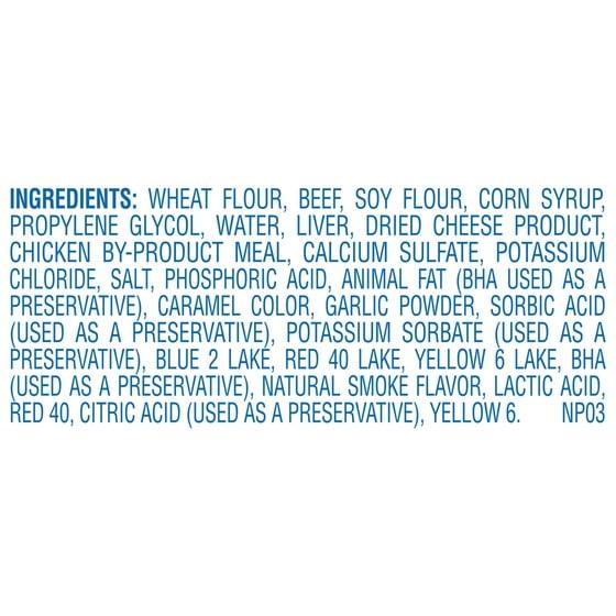 Wheat Flour, Beef, Soy Flour, Corn Syrup, Propylene Glycol, Water, Liver, Dried Cheese Product, Chicken By-Product Meal, Calcium Sulfate, Potassium Chloride, Salt, Phosphoric Acid, Animal Fat (BHA Used as a Preservative), Caramel Color, Garlic Powder, Sorbic Acid (Used as a Preservative), Potassium Sorbate (Used as a Preservative), Blue 2 Lake, Red 40 Lake, Yellow 6 Lake, BHA (Used as a Preservative), Natural Smoke Flavor, Lactic Acid, Red 40, Citric Acid (Used as a Preservative), Yellow 6. NP03.
