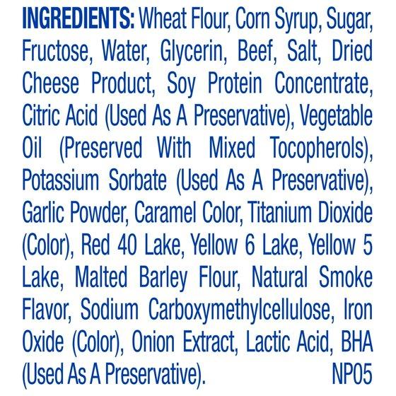 Wheat Flour, Corn Syrup, Sugar, Fructose, Water, Glycerin, Beef, Salt, Dried Cheese Product, Soy Protein Concentrate, Citric Acid (Used as a Preservative), Vegetable Oil (Preserved with Mixed Tocopherols), Potassium Sorbate (Used as a Preservative), Garlic Powder, Caramel Color, Titanium Dioxide (Color), Red 40 Lake, Yellow 6 Lake, Yellow 5 Lake, Malted Barley Flour, Natural Smoke Flavor, Sodium Carboxymethylcellulose, Iron Oxide (Color), Onion Extract, Lactic Acid, BHA (Used as a Preservative). NP05
