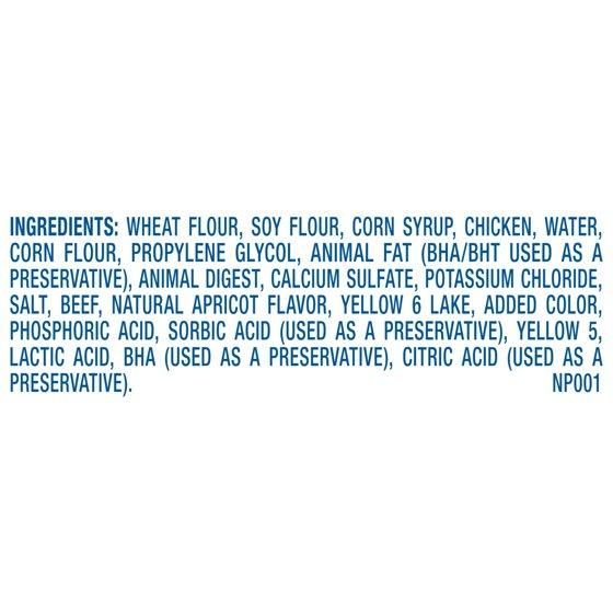 Wheat Flour, Soy Flour, Corn Syrup, Chicken, Water, Corn Flour, Propylene Glycol, Animal Fat (Bha/BHT Used As A Preservative), Animal Digest, Calcium Sulfate, Potassium Chloride, Salt, Beef, Natural Apricot Flavor, Yellow 6 Lake, Added Color, Phosphoric Acid, Sorbic Acid (Used As A Preservative), Yellow 5, Lactic Acid, Bha (Used As A Preservative), Citric Acid (Used As A Preservative)