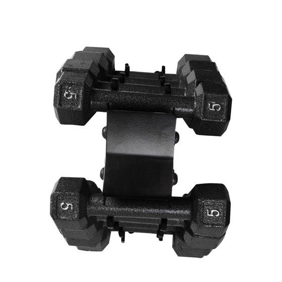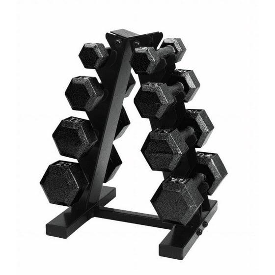 - Set includes: a 5 lb dumbbell pair, a 10 lb dumbbell pair, a 15 lb dumbbell pair, a 20 lb dumbbell pair, and a 20" A-frame dumbbell rack for easy storage