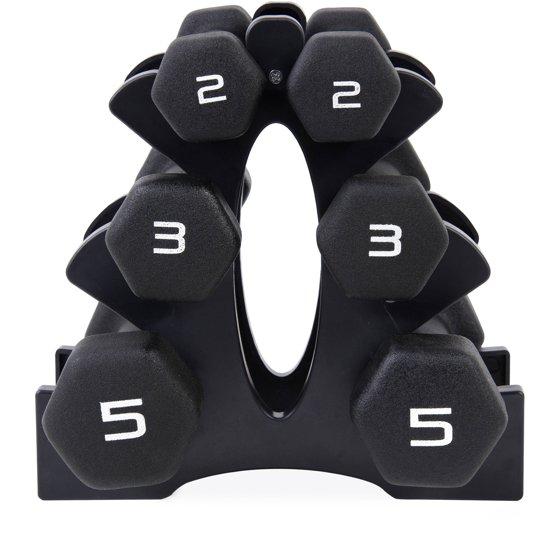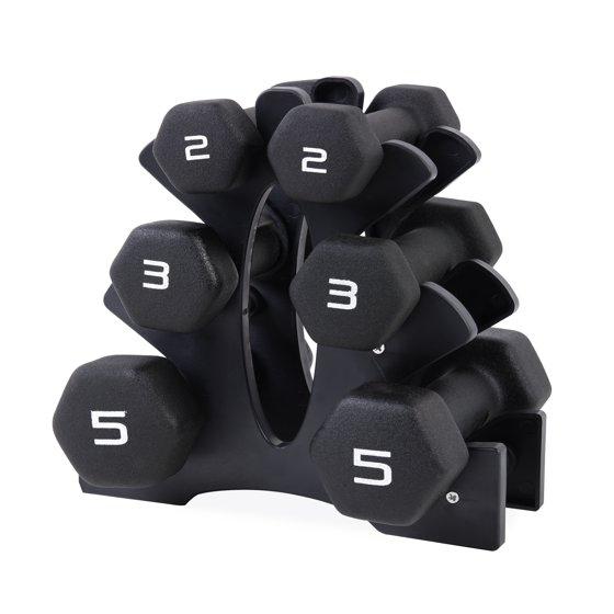 - What's Included A convenient dumbbell storage rack with 3 pairs of dumbbells in 2-pounds, 3-pounds, and 5-pounds