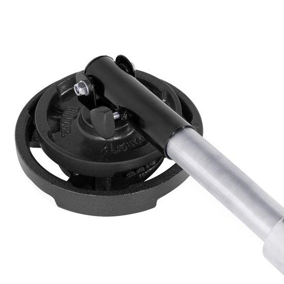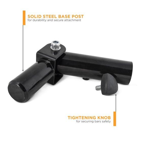 - Easily insert solid base post into Olympic weight plates (plates that are 25lb and over), then insert bar into long pivot sleeve and securely tighten the tightening knob