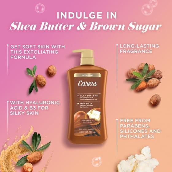 - Spark your senses with the long-lasting fragrance of creamy shea butter and warm brown sugar with Caress Shea Butter & Brown Sugar Exfoliating Body Wash for women