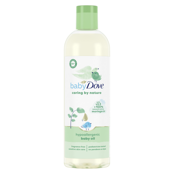 Give your babys skin a healthy foundation from the first moisturizing application Contains vitamin E and 100% natural active moringa oil Helps your babys skin retain natural moisture and protects skin from dryness Tear-free, hypoallergenic baby oil, pediatrician and dermatologist tested Fragrance free, paraben free, 99% naturally derived* and contains no sulfates, dyes, or mineral oil Vegan and Dove is PETA Approved, meaning we do not test on animals, anywhere in the world","From the very first time their little fingers graze through a blade of grass or feel the velvety soft petal of a flower, your babys obsession with nature is awakened. If they ever discovered a moringa flower, they wouldnt believe what it could produce, or how much it could make a difference to their delicate skin. Baby Dove Caring By Nature Baby Oil contains 100% natural moringa oil, made to soothe dryness and nourish your babys delicate skin. Perfectly formulated for your babys face, body and hair, this body oil also contains vitamin E. Ultra-gentle and fragrance-free, Baby Dove Caring By Nature Ultra Gentle Baby Oil is one of the most versatile skincare baby products around. Its great at sealing in moisture after washing and keeping your babys skin super-soft. It can be used as a massage oil (both for you and your baby) which is a wonderfully relaxing ritual at any time, especially post-bath time and pre-bedtime. Its perfect for soothing dry patches and helps relieve the itchiness a dry scalp can bring. Youll love how soft and nourished Baby Dove Caring By Nature Baby Oil leaves your babys skin! *Naturally derived: We consider an ingredient naturally derived if its unchanged from nature or has a natural source and undergone some processing but keeps more than 50% of its original structure. 99% of our oil formula is made up of naturally derived ingredients.","Vegetable Oil, Isopropyl Palmitate, Moringa Oleifera Seed Oil, Stearic Acid, Tocopherol",""," Lightweight baby care formula Ultra-gentle and suitable for your newborn, our baby massage oil is lightweight and is suitable to use as a baby hair oil Created with careFormulated without parabens or mineral oil, our baby oil is dermatologist tested and suitable for everyday use. Deeply nourishing and rich in skin-natural nutrients, this baby massage oil helps to reduce visible dryness for glowing skin Naturally-derived* formula99% naturally-derived* baby care formula, our baby massage oil is infused with vitamin E and moringa oil. * We consider an ingredient naturally derived if its unchanged from nature or has a natural source and undergone some processing but keeps more than 50% of its original structure. 99% of our oil formula is made up of naturally derived ingredients","For best results, use this lightweight baby massage oil after bathing your baby with Baby Dove Caring By Nature Ultra Gentle Foaming Wash. Warm the baby oil in your hands and gently massage it in while their skin is still a little damp. This baby oil is also perfect for your babys scalp and hair.","","Baby massage can really help your baby to relax and may even improve their sleep. Actually, theres something soothing about the action for both of you. Why not try using Baby Dove Caring By Nature Baby Oil with a gentle, bonding massage before bedtime?