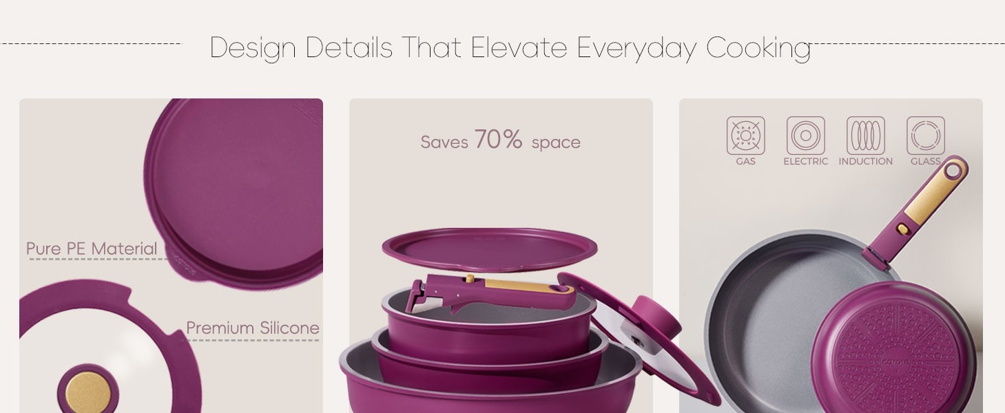 - Space-Saving Design: Engineered for compact kitchens, the Carote cookware set stacks neatly to save cabinet space, saving up to 70% space.