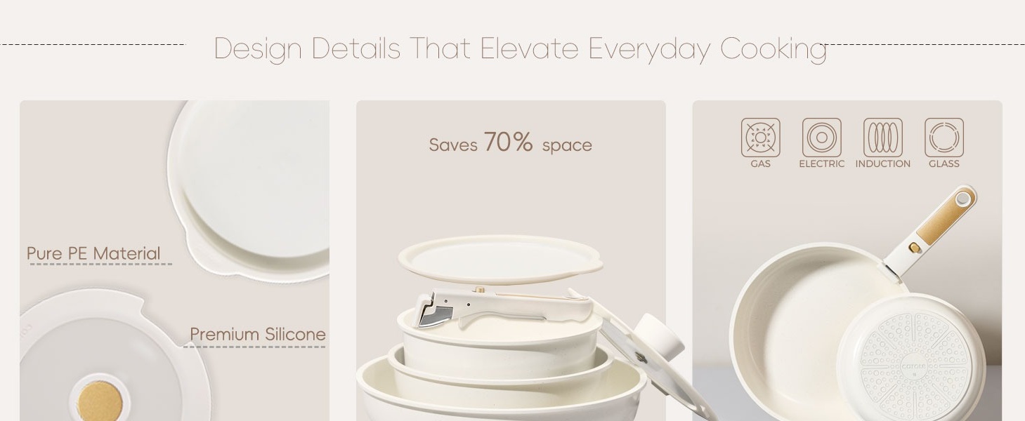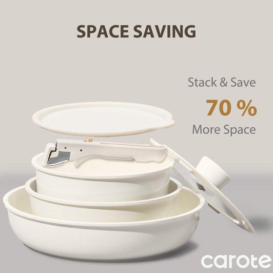 - Space-Saving Design: Engineered for compact kitchens, the Carote cookware set stacks neatly to save cabinet space, saving up to 70% space.
