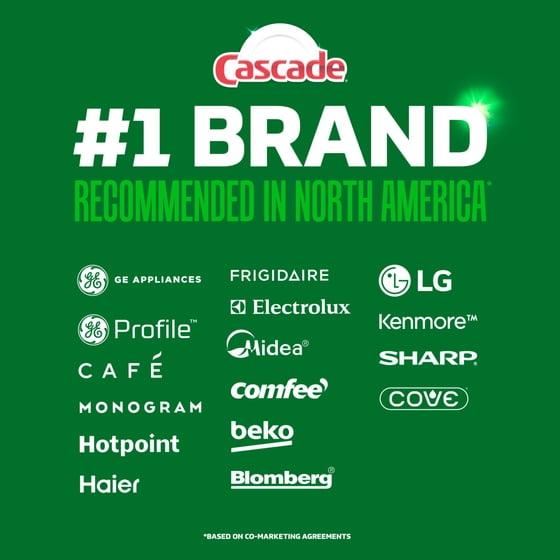 - #1 RECOMMENDED BRAND IN NORTH AMERICA*: *More dishwasher brands in North America recommend Cascade based on co-marketing agreements vs. other automatic dishwasher detergent brands. There is a reason we've been trusted for over 70 years!