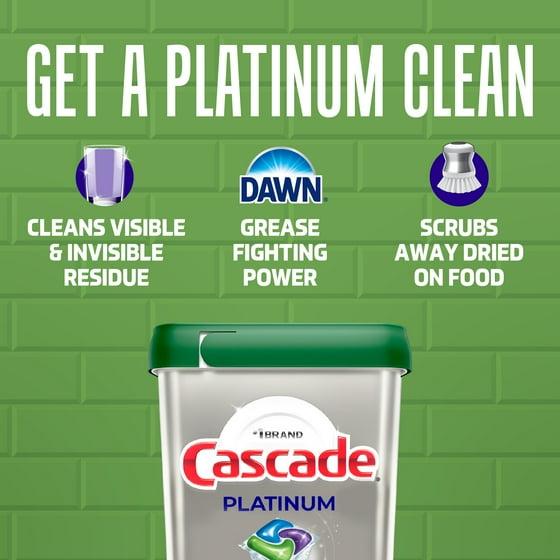 - Cascade Platinum Action Pacs dishwasher detergent cleans burnt-on messes in just one wash, with no pre-wash needed. That's because Platinum has 50% More Cleaning Power* (*% cleaning ingredients vs. Cascade Complete Action Packs) to tackle burnt-on foods. It dissolves fast to start cleaning right away, releasing the soaking power of Dawn dishwashing liquid, while food-seeking enzymes latch on and break down food into particles so small they can flow right down the drain. Plus, Cascade Platinum dishwashing detergent is formulated to help prevent hard-water filming-keeping your machine looking fresh and clean. Lemon Citrus 45 Count.