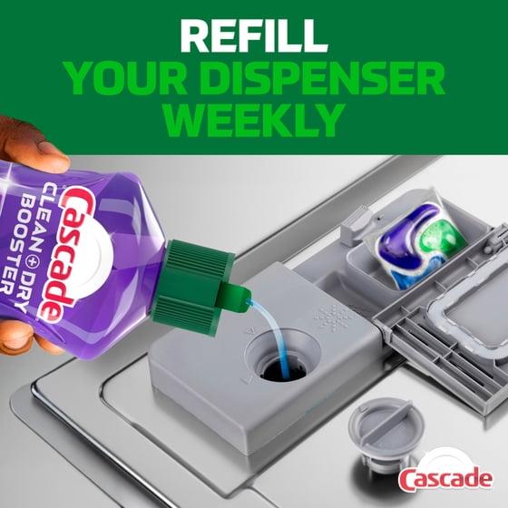 - EASY TO USE: Refill your rinse aid dispenser weekly with Cascade Clean & Dry Booster, using our easy to pour, no-drip cap